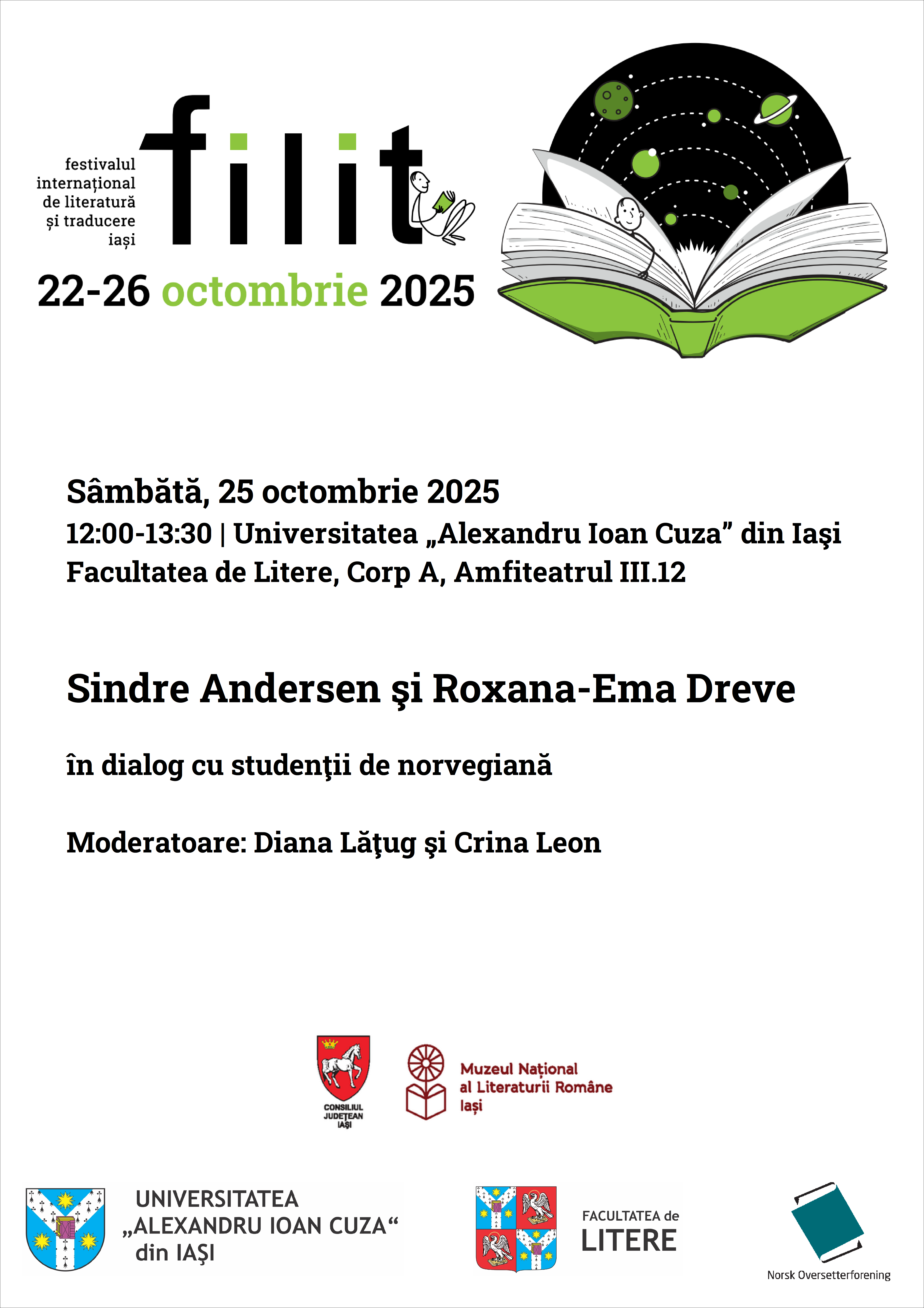 În cadrul Festivalului internațional de literatură și traducere (FILIT), studenții de la cursurile de norvegiană, organizate de Facultatea de Litere a Universității „Alexandru Ioan Cuza” din Iaşi, pot intra în dialog cu traducătorii Sindre Andersen și Roxana-Ema Dreve. Moderatoare: Diana Lățug și Crina Leon.