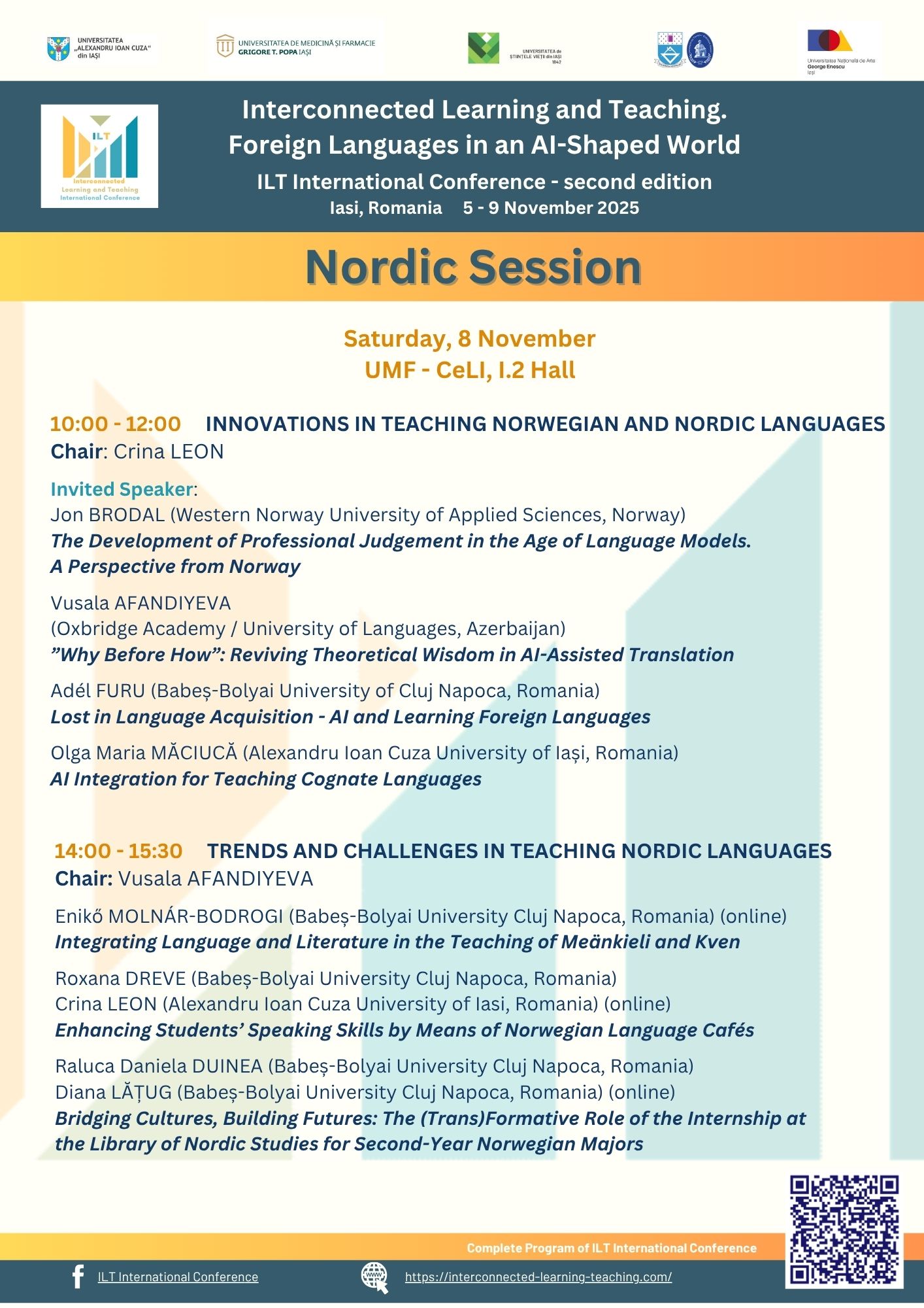 În data de 8 noiembrie 2025, în cadrul conferinței internaționale "Interconnected Learning and Teaching. Foreign Languages in an AI-Shaped World" (Iași, 5 – 9 noiembrie 2025), sunt organizate două paneluri nordice:
